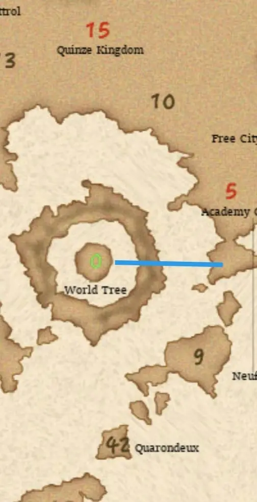 Jalur terbang Shedy diwarnai dengan garis biru (dari Selatan Academy City Cinqres langsung meluncur ke Pohon Dunia)