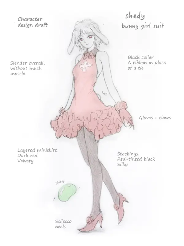 Dia melayang di udara, anggota tubuhnya yang anggun tidak ditutupi sehelai pun pakaian. Kemudian, noda cair layaknya darah mulai terbentuk, menodai putih murni tubuhnya. Cairan itu berubah menjadi gaun merah tua dengan kerah hitam dan rok mini yang mengembang. Stoking hitam dengan sedikit merah, sepatu hak tinggi merah, dan sarung tangan merah melilit cakar yang tajam melengkapi setelan.